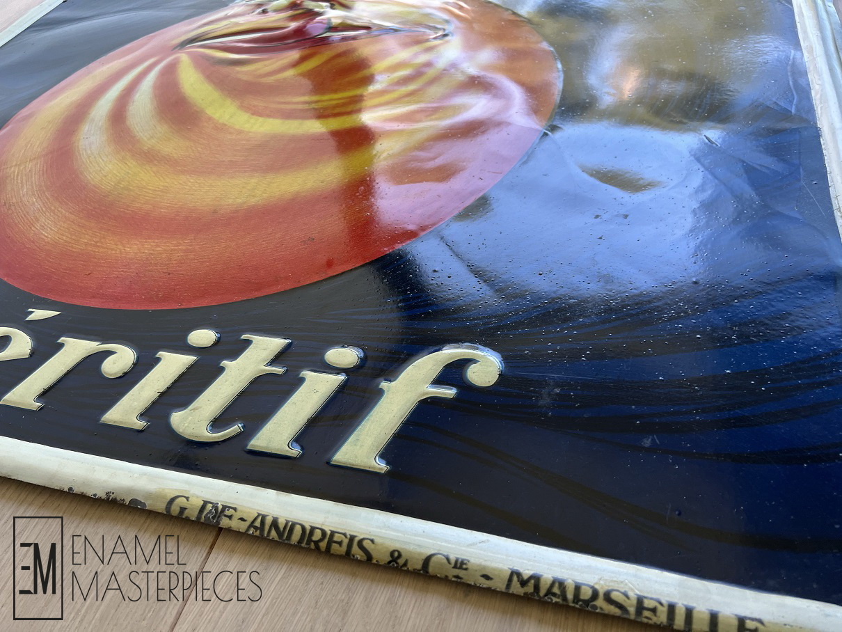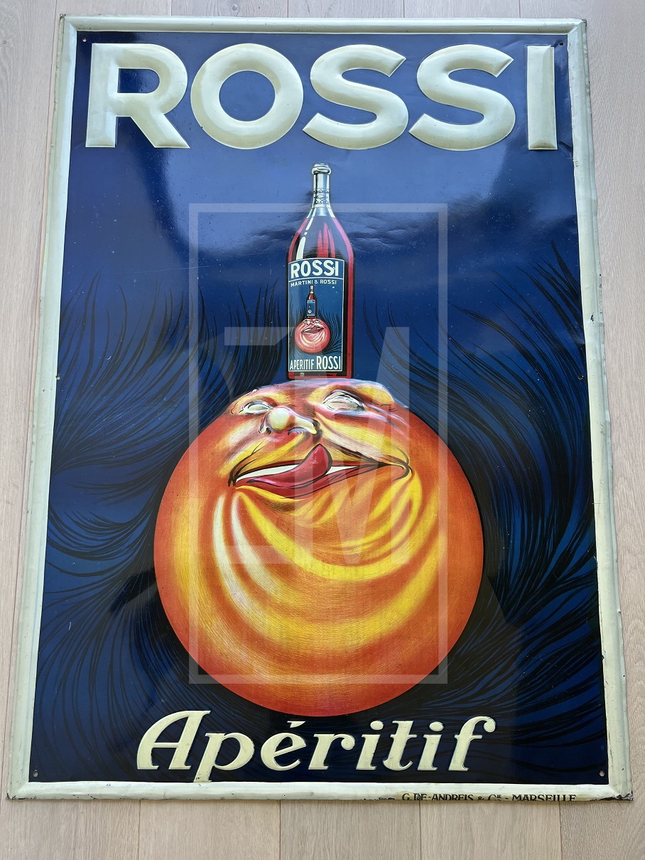 The Rossi Apéritif is one of the most attractive designs in tin. Showing a bottle of Rossi’s Apéritif resting on top of a big orange with a face licking its lips. It is made after a classic Italian advertising poster by Jean Droit (1884 – 1961) a French artist. His posters, and later his illustrations on all subjects, portraits and others, published by numerous magazines and in luxury books, are universally known and appreciated. The bright colours and huge size (100cm x 138cm!) of this tin plate make it a real eyecatcher.